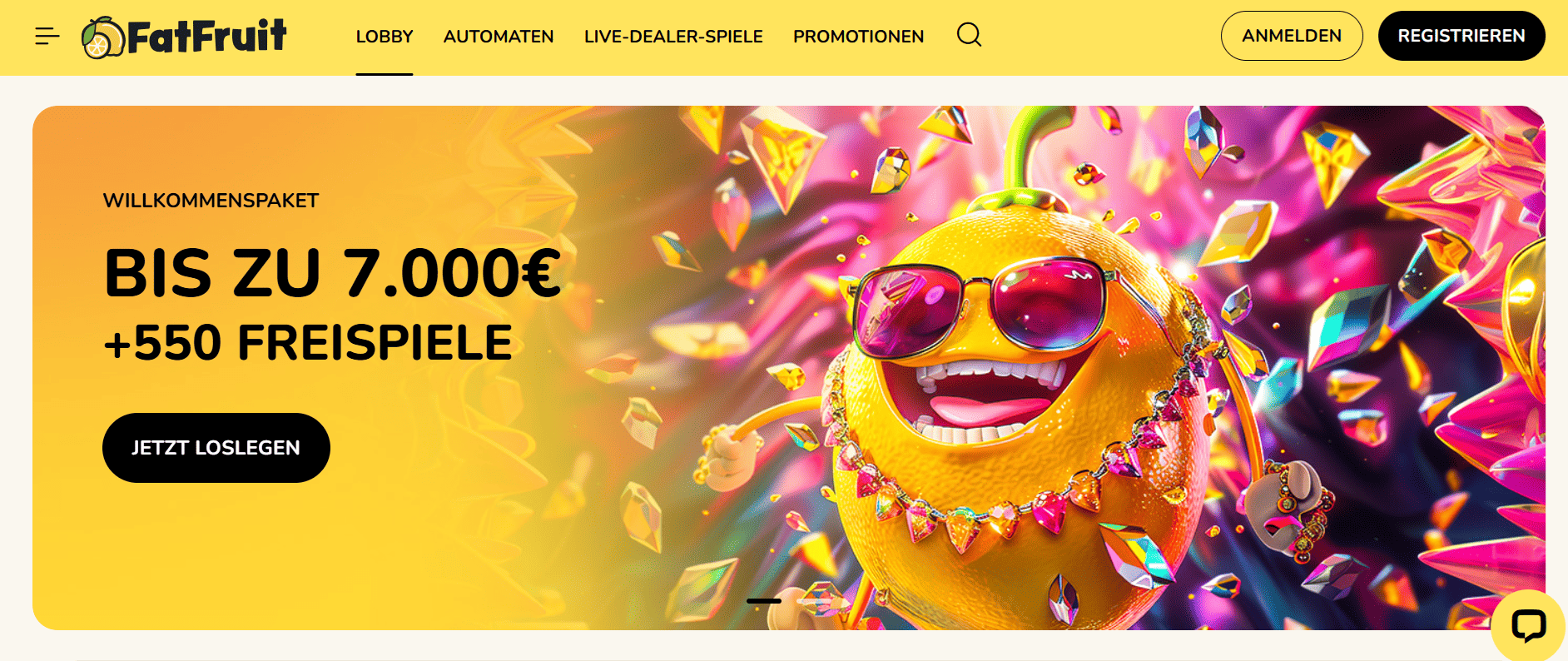 Das FatFruit Casino belegt in unserem Online Casino Ranking den zweiten Platz. Zwar erhalten Sie hier keinen 300 Prozent Bonus, dafür aber einen noch vielversprechenderen 325% Bonus, der Ihr Spielerkonto mit bis zu 7.000 € und 550 Freispiele auflädt. Das Angebot erstreckt sich über die ersten vier Einzahlungen und unterliegt fairen Bedingungen. Somit finden Sie bei FatFruit einen Bonus, der den Einstieg in das über 12.000 Titel umfassende Spieleportfolio erleichtern. Egal ob klassische Spielautomaten oder moderne Live-Casino-Games – für Abwechslung ist gesorgt.