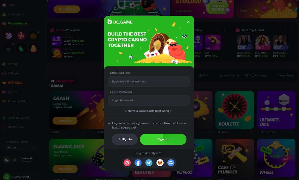 BC.Game belegt in unserem Bitcoin Casino Vergleich Platz 3. In diesem Bitcoin Casino ohne Verifizierung erwartet Sie ein riesiges Spieleportfolio mit Slots, Live Casino, Crash Games und auch Sportwetten. Anonymes Spielen steht in diesem BTC Casino im Vordergrund.