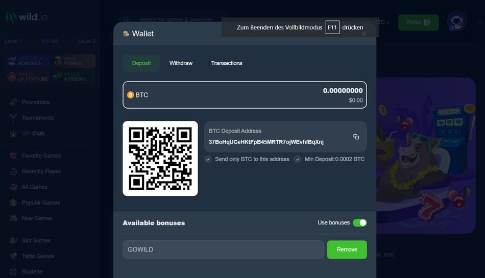 Nach der Registrierung im Instant Casino, ist eine Einzahlung notwendig, um die vielen Spiele nutzen zu können. Die Einzahlung kann mit Bitcoin oder Altcoin erfolgen.
