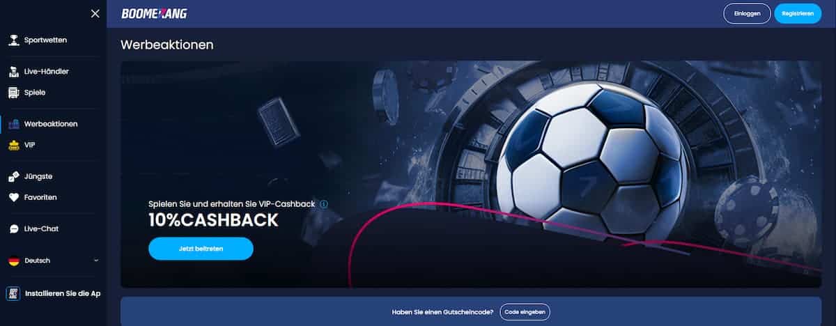 Für bestehende Kunden gibt es einen wöchentlichen Boomerang Sportwetten Bonus von 50 % bis zu einer Einzahlung von 500 Euro. Für verlorene Boomerang Wetten gibt es einen Cashback-Bonus von 10 % bis zu 500 Euro.