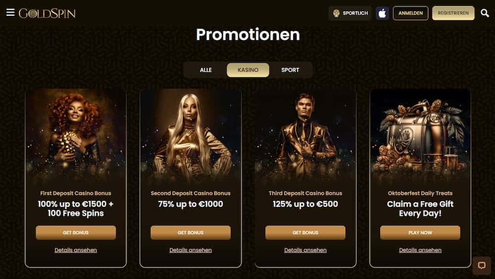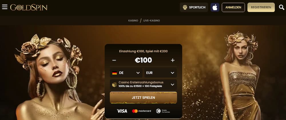 Bereits der ersten GoldSpin Casino Neukundenbonus hat einen 100% Wert von bis zu 1.500 Euro. Zusätzlich erhalten Sie weitere 100 Freispiele, die bereits ab der Mindesteinzahlung von 10 Euro bereitstehen. Belohnt werden zusätzlich