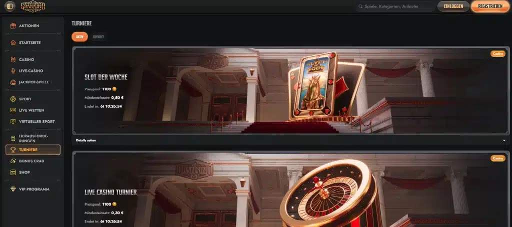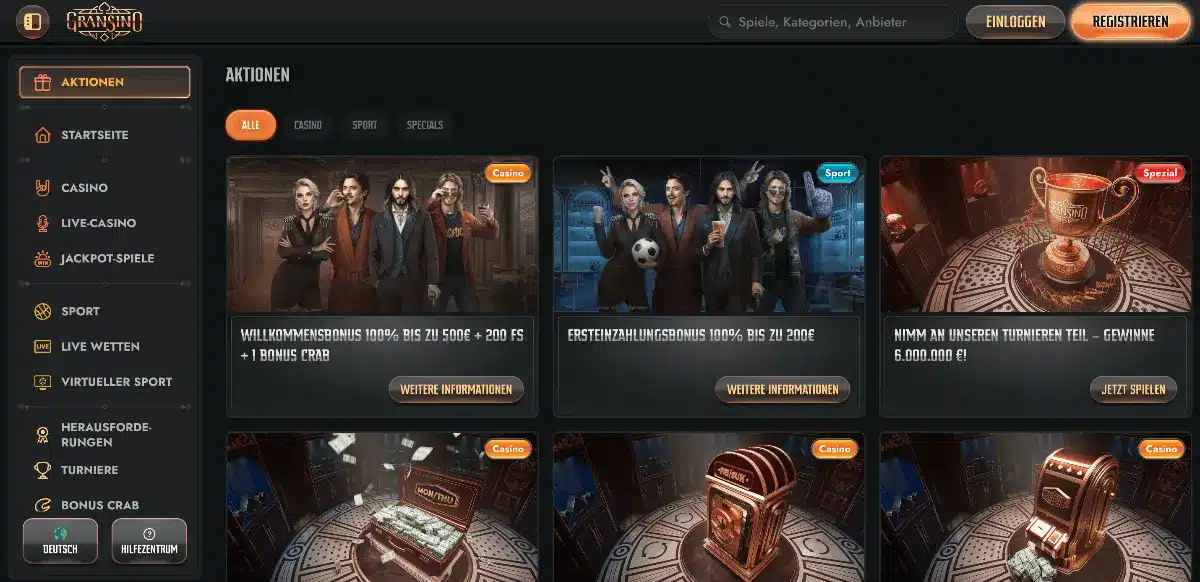 Der Gransino Casino Bonus für neue Kunden konnte unsere Erwartungen nicht vollends erfüllen. Wir sind der Meinung, dass er sich eher für Anfänger als für Highroller eignet. Ihre erste Einzahlung wird bis zu einem Betrag von 500 € verdoppelt – nicht schlecht, aber auch nicht überragend. Zum Angebot gehören außerdem 200 Freispiele sowie ein Gratis-Dreh an der sogenannten Bonuskrabbe.