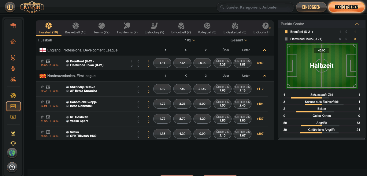 Wenn Sie einmal eine Pause von Blackjack, Slots und Co. benötigen, bietet Gransino den perfekten Rückzugsort: das Sportwettenangebot. Sie können aus mehr als 20 verschiedenen Sportarten wählen – darunter auch eSports. Einen Bereich mit Willbet Casino Deutschland – Willkommen Bonus und Top SpieleLive-Wetten gibt es ebenso wie einen speziellen Willkommensbonus für Sportwetten von 100 % bis zu 200 €. Ein Reload-Bonus, ein Cashback-Angebot sowie weitere Aktionen wie ein Kombiwetten-Boost runden den sehr guten Eindruck des Sportwettenbereichs ab.