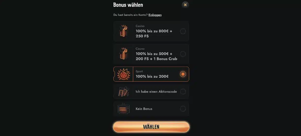 Klicken Sie oben rechts auf den orange hinterlegten Button mit der Aufschrift “Registrieren”. Sie werden anschließend gebeten, sich für einen Bonus zu entscheiden. Sie können auch auf den Bonus verzichten.