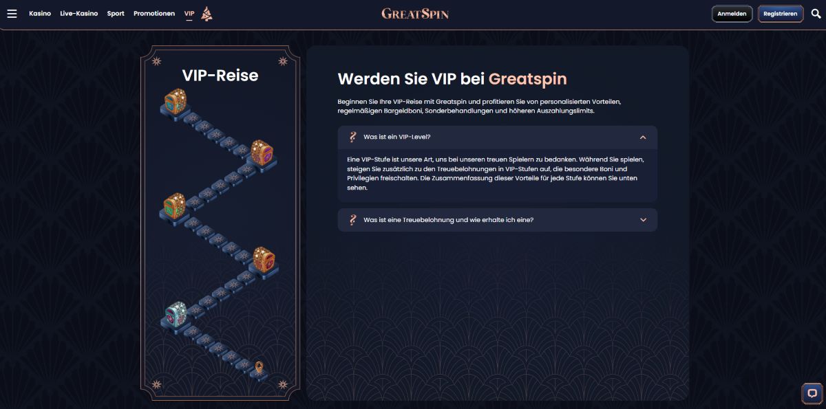 Öffnen Sie die Casino-Homepage von GreatSpin. Klicken Sie oben rechts auf den blauen Button „Registrieren“.