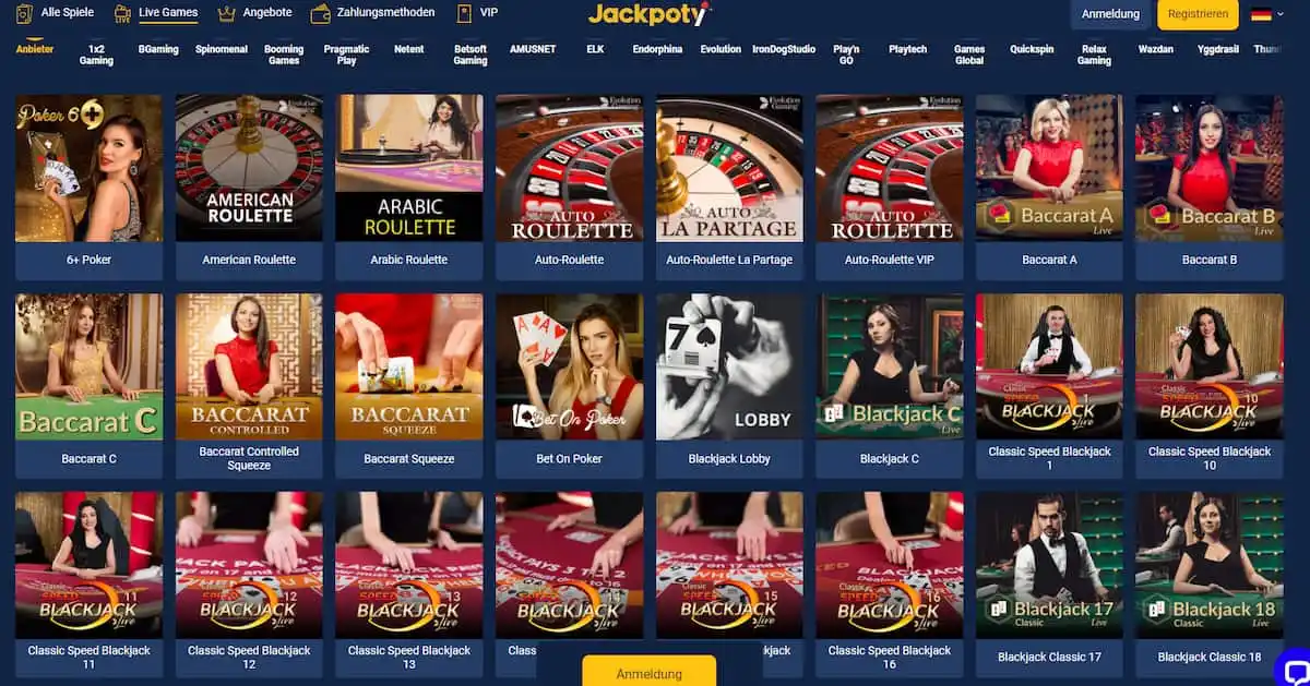 In einem Online Casino Vergleich darf selbstverständlich auch ein prüfender Blick in das Live Casino Angebot nicht fehlen. Um Ihnen von unseren Live Casino Jackpoty Erfahrungen berichten zu können, haben wir daher zuerst das Spielangebot näher betrachtet. Vor allem die Auswahl an Live Dealer Roulette und Live Blackjack hat uns hierbei beeindrucken können. Hier können Sie nämlich sogar deutsches Online Roulette sowie Live Roulette aus dem Casino Bad Homburg ausprobieren. Dazu kommen mehrere Varianten von Poker sowie Baccarat und natürlich sind auch Glücksradspiele sowie Spielshows mit am Start.