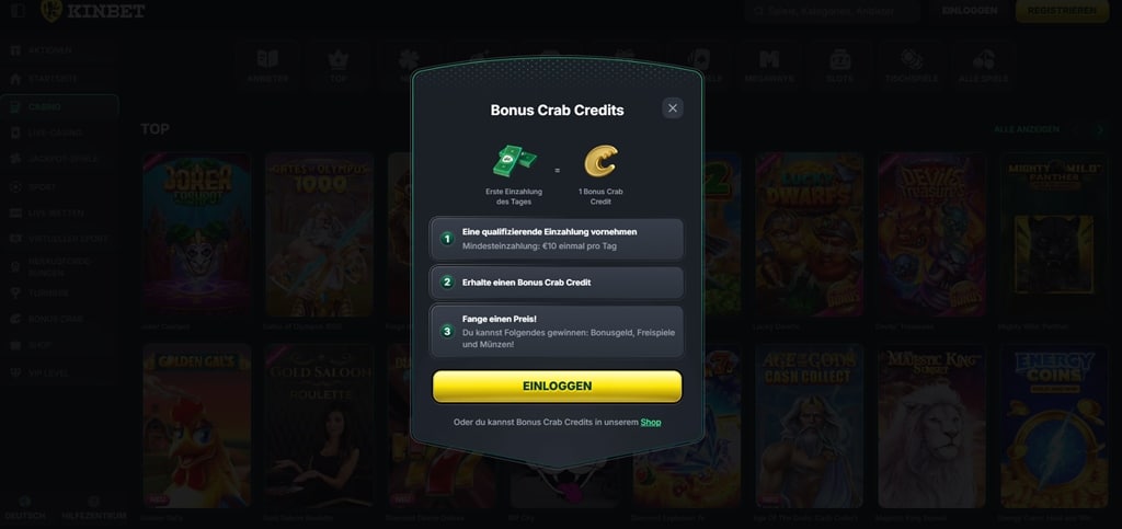 Sie starten mit dem Kinbet Willkommensbonus. Das Neukundenangebot steht Ihnen einmalig für die erste Einzahlung zur Verfügung. Sie können die Willkommensofferte mit einem Klick aktivieren, ohne Kinbet Bonus Code.