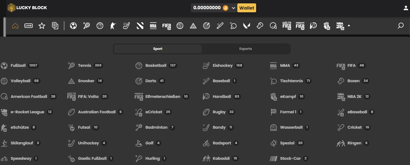 Wie nicht anders zu erwarten, liegt der Schwerpunkt der Lucky Block Wetten auf Fußball. Zum Zeitpunkt unseres Tests gab es beispielsweise 1250 Wettoptionen, was für einen Tag ohne Bundesligaspiele oder andere große internationale Turniere wirklich ordentlich ist.