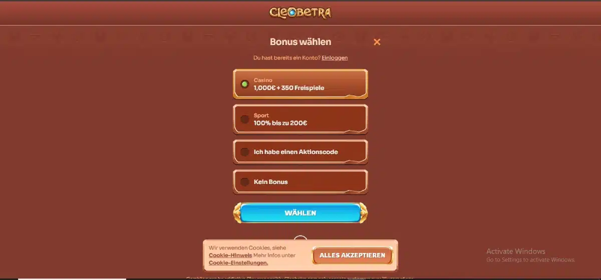 Sie erhalten einen 100 %-Bonus bis zu 400 € bei einer Mindesteinzahlung von 20 € und einem 50-fachen Wetteinsatz. Die Frist für die Erfüllung der Anforderungen beträgt 30 Tage.