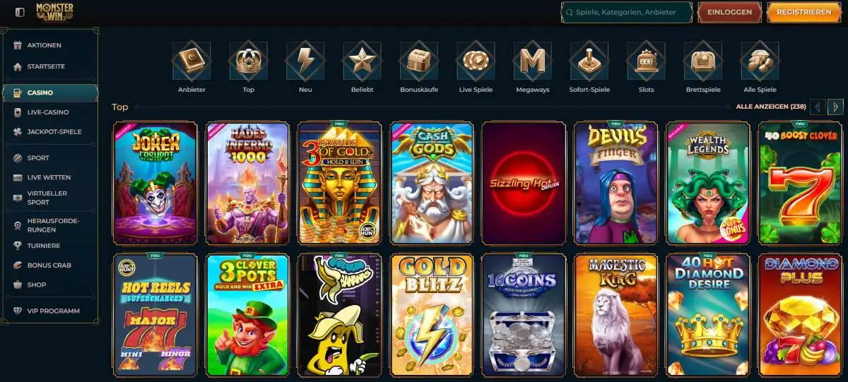 Das Online Casino hat über 12.000 Spiele zur Auswahl. Es sind alle Spielsektionen vertreten. Monsterwin arbeitet mit über 100 Providern zusammen.