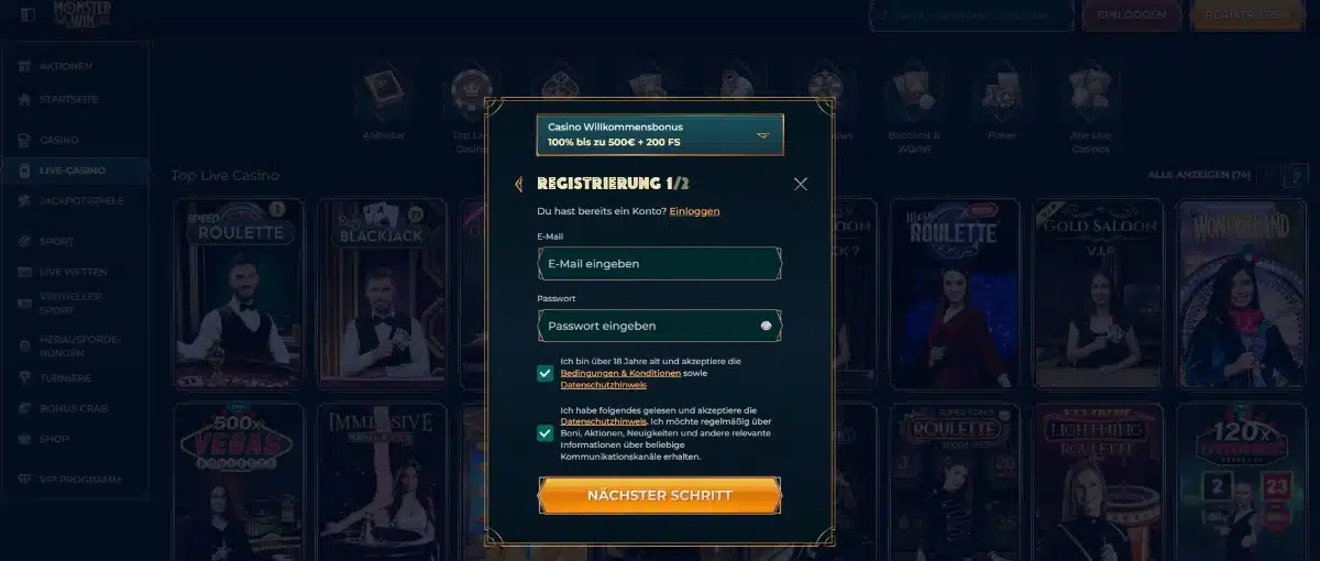 Sie legen mit einem 100% bis 500 Euro Monsterwin Neukundenbonus. Weitere 200 Freispiele erhalten Sie zusätzlich.