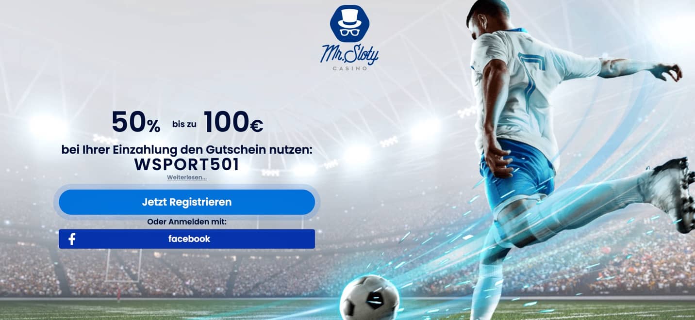 Neue Kunden werden begeistert sein. Denn der Mr. Sloty Bonus für den Sportbereich bringt den neu registrierten Nutzern maximal 100 Euro Bonus. Der Bonuswert liegt bei 50 Prozent. Das heißt, die Hälfte der ersten Einzahlung wird als Bonus gutgeschrieben – die Maximalsumme beträgt, wie bereits erwähnt, 100 Euro. Somit kann gleich zu Beginn die einbezahlte Summe etwas erhöht werden – das heißt, mehr Kapital für den weiteren Spiel- und Wettspaß. Hier können sie daher einen echt guten Mr.Sloty Test und Mr.Sloty Bewertung finden.