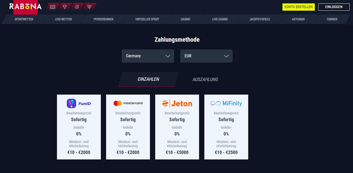 | Einzahlungsmethode | Mindestbetrag (Euro): | Gebühr: |