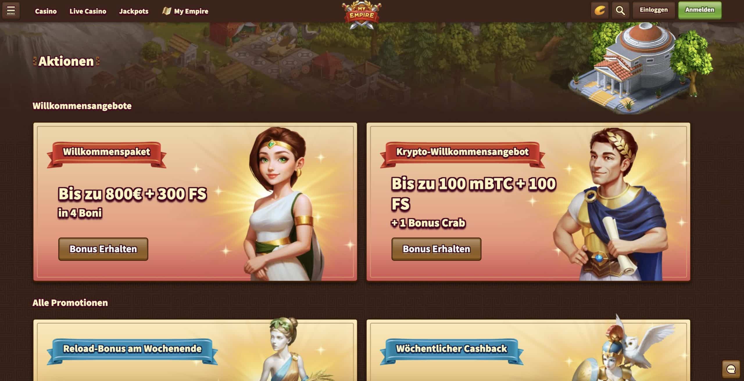 Vier Einzahlungen bekommen neue MyEmpire Casino online Kunden bei Interesse belohnt. Es geht um bis zu 800 € und 300 Freispiele. Ein konkreter Krypto Bonus bis zu 100 mBTC, 100 Free Spins und eine Bonuskrabbe sind die Alternative.