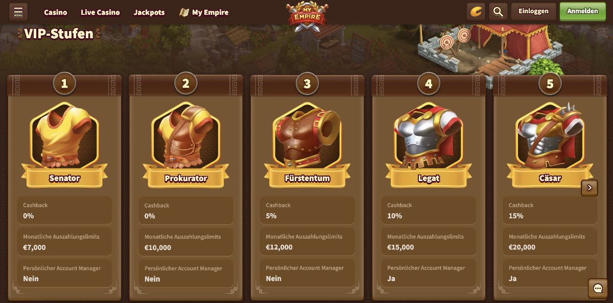 MyEmpire bietet ein spannendes Treueprogramm an, bei dem Sie von einfachen Senator bis hin zum Imperator Cäsar aufsteigen können. Auch wenn das VIP Programm klassisch gehalten ist und Sie ganz schlicht Punkte sammeln, indem Sie Echtgeld Einsätze tätigen, gefällt uns die Aufmachung, die perfekt zur Thematik der Webseite passt, sehr gut. Als Belohnungen für Ihre Treue werden Sie mit erhöhtem Cashback, höheren Auszahlungslimits, einem persönlichen Manager und speziellen VIP Boni belohnt.