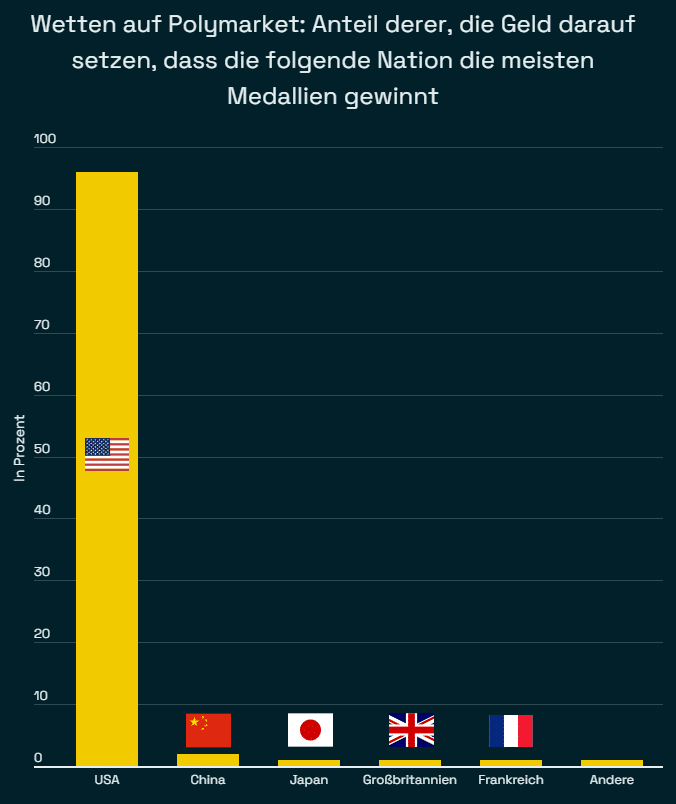 Dies bedeutet nicht, dass es keine Profiteure der Sommerspiele gibt. Wie so oft verändern Sport-Events in diesem Ausmaß beispielsweise auch die Krypto-Landschaft, zumindest geringfügig. Anleger, die sehr spekulativ unterwegs sind, investieren dieser Tage in einen Krypto-Vorverkauf namens The Meme Games; wie nachhaltig die Gewinne sind, darf bezweifelt werden. Mehr Geld fließt indes in Prognosemärkte, beispielsweise auf Polymarket: Dort setzen sage und schreibe 96 Prozent darauf, dass die USA die meisten Medaillen gewinnen. An zweiter Stelle rangiert China mit 2 Prozent.