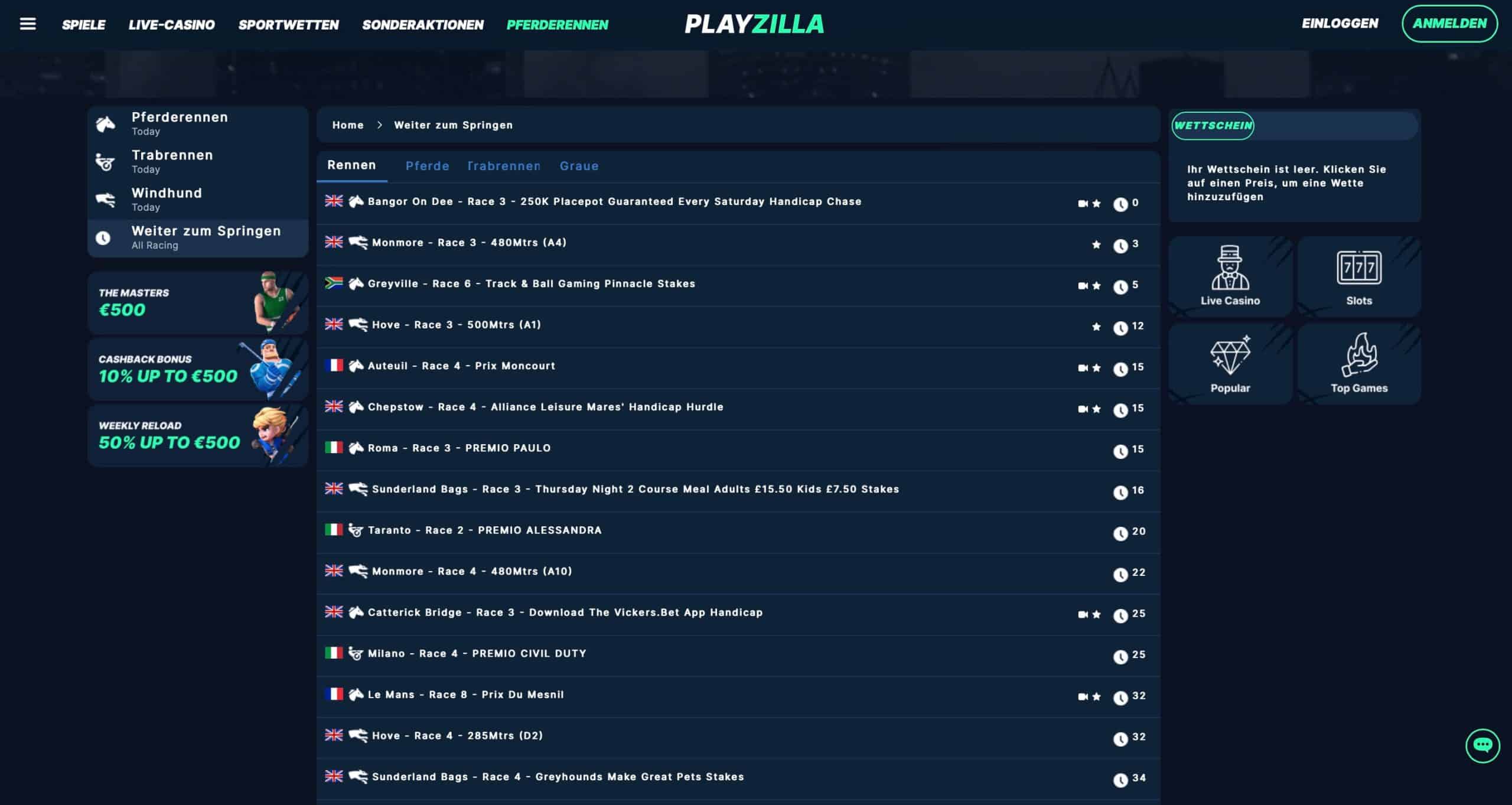 Damit dürfte für jeden Tipp-Fan die passende Sportart vorhanden sein, denn sogar exotische Wettkämpfe wie Wasserball oder Gaelic Football sind in der Wettauswahl von Playzilla zu finden. Besonders positiv bewerten wir, dass gefragte Kategorien wie Windhund- und Pferderennen angeboten werden – das ist längst nicht bei jedem Buchmacher der Fall.