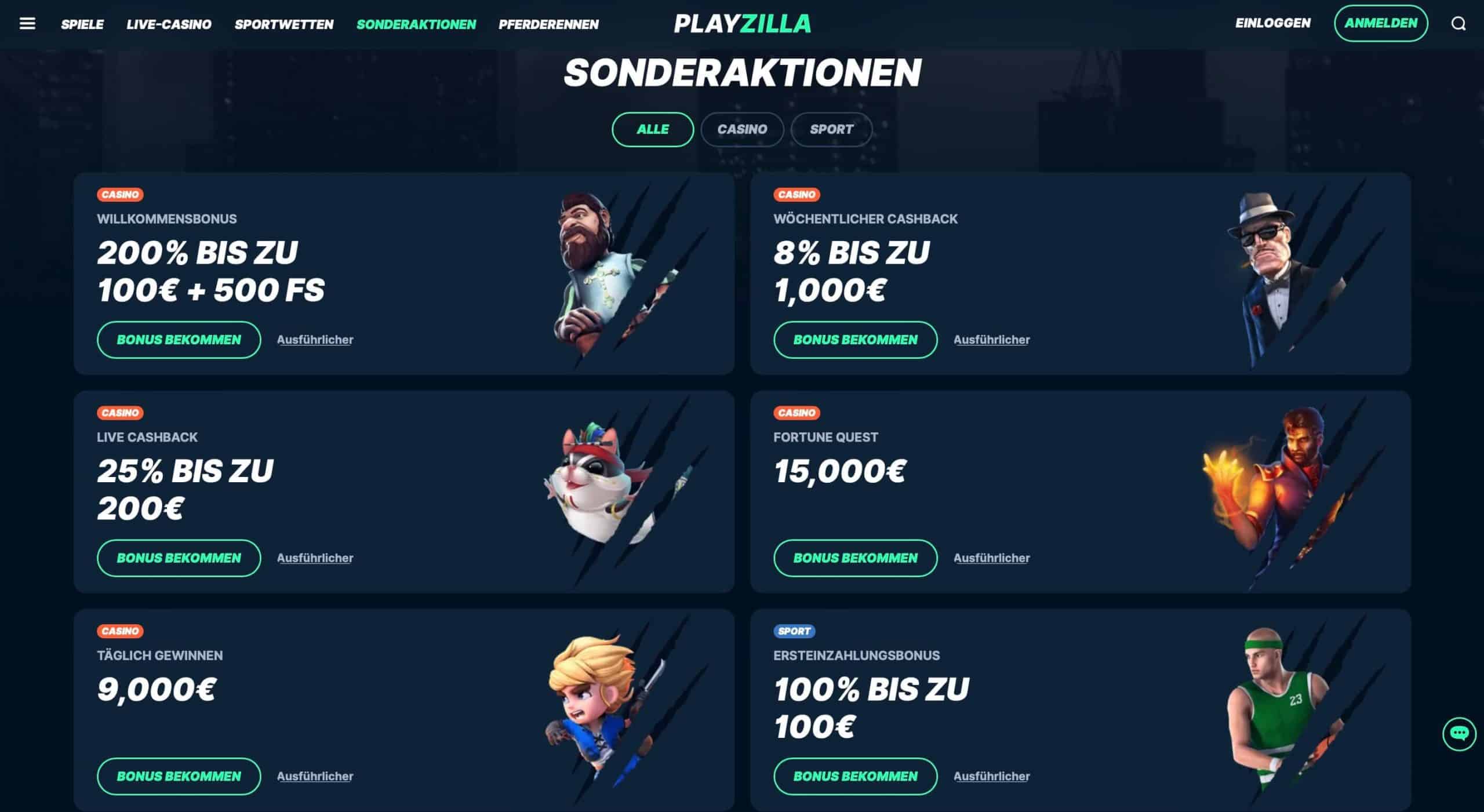 Da für jede Bonusaktion andere Umsatzanforderungen gelten, lohnt es sich, einen Blick auf die geltenden Bedingungen zu werfen. Unsere Playzilla Bewertung fällt an dieser Stelle äußerst positiv aus, denn obwohl der Buchmacher gerade erst am Markt platziert wurde, verfügt der Anbieter über eine umfassende Auswahl an Bonus- und Sonderaktionen für bereits registrierte Kunden.