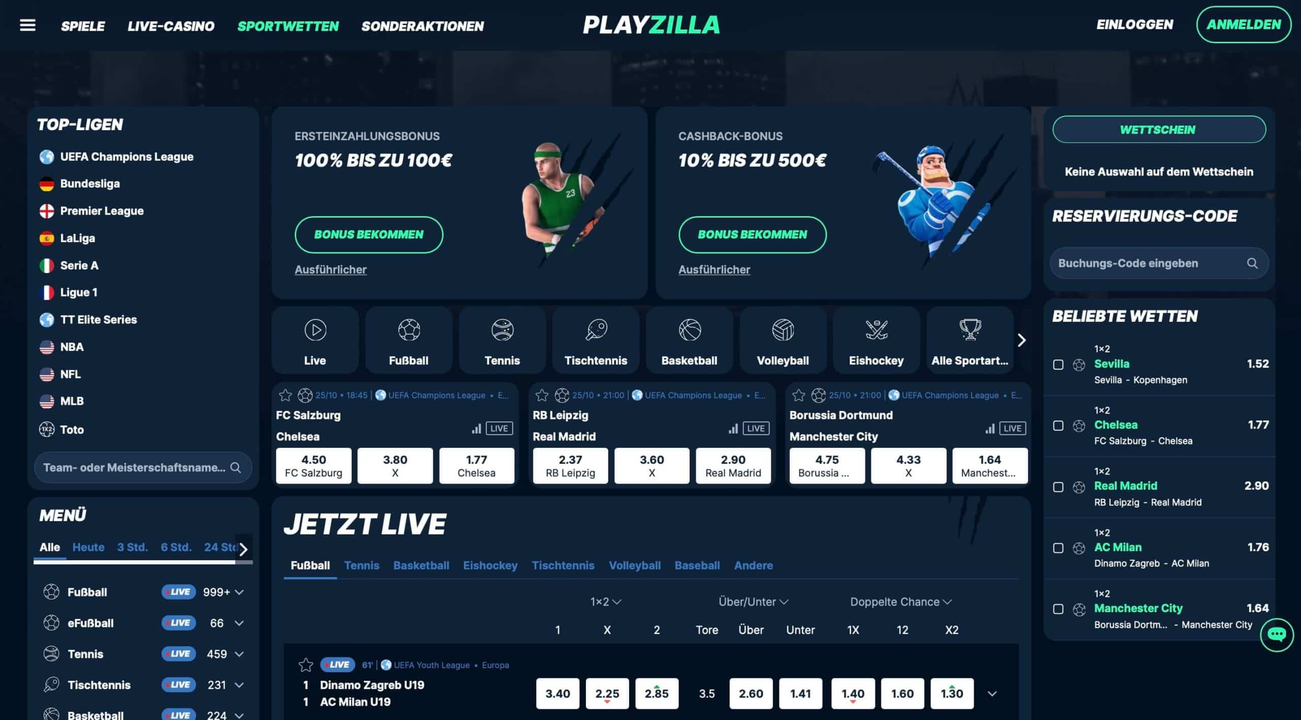 Bonus- und Einzahlungsbetrag müssen bei Playzilla lediglich dreimal umgesetzt werden, um sich den Sportbonus von bis zu 100 Euro zu sichern – andere Wettanbieter arbeiten mit deutlich höheren Anforderungen, was Playzilla zu einer attraktiven Alternative in puncto Bonusangebot macht.