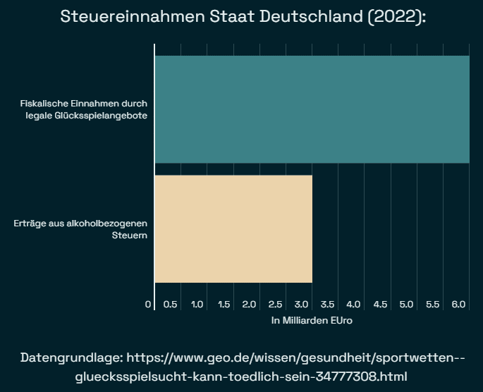 Der Hype rund um das Thema Sportwetten hat auch für den deutschen Staat Auswirkungen. Dieser profitiert zunehmend von den fiskalischen Einnahmen durch legale Glücksspielangebote. Diese erreichten unlängst 6 Milliarden Euro pro Jahr, wohingegen die Erträge aus alkoholbezogenen Steuern bei etwas mehr als 3 Milliarden Euro lagen. Als Einnahmequelle ist Glücksspiel nunmehr doppelt so wichtig wie Alkohol.