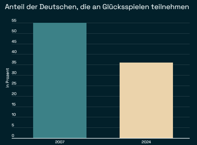 Nimmt man das gesamte Glücksspiel-Segment in den Blick, dann zeigt sich ein anderes Bild. Im Jahr 2007 gaben 55 Prozent der Deutschen an, mehr oder weniger regelmäßig Glücksspiel-Angebote wahrzunehmen. In diesem Jahr beträgt der Anteil nunmehr 36 Prozent. Während sich Sportwetten großer Beliebtheit erfreuen, sinken die Umsätze unter anderem im Lotterie-Bereich.