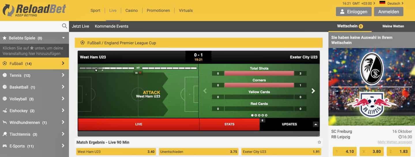 Kein renommierter Buchmacher kann darauf verzichten, seinen Kunden neben den klassischen Pre-Match Wetten, welche Sie vor dem Spielbeginn abgeben, auch Tipps auf laufende Begegnungen anzubieten. In unserem Reloadbet Test fanden wir heraus, dass den Live-Wetten bei diesem Bookie sogar ein eigener Bereich spendiert wurde.