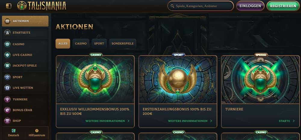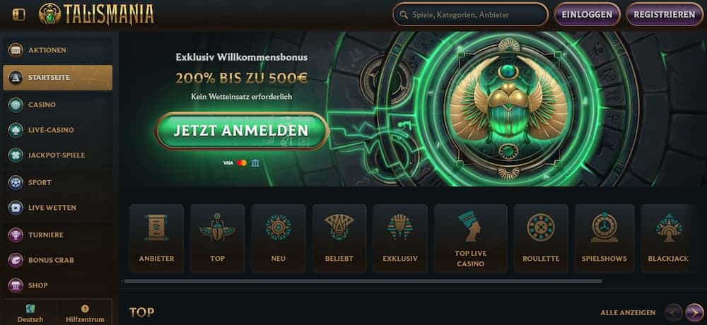 | Willkommensbonus im Talismania Casino | 200 % bis zu einer Einzahlung von 500 Euro |