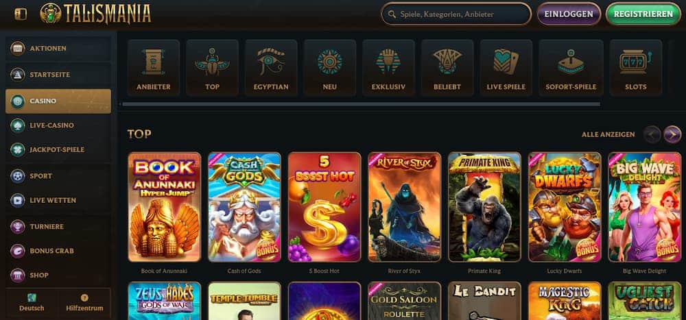 In der Rubrik “Casino” finden sich zahlreiche bekannte Automaten wie beispielsweise “Book of Anunnaki”, “Fruits of Madness” oder “Cash of Gods”. Viele davon lassen sich auch ohne Echtgeld spielen. Das ist eine gute Option, um sich mit den wichtigsten Funktionen vertraut zu machen.